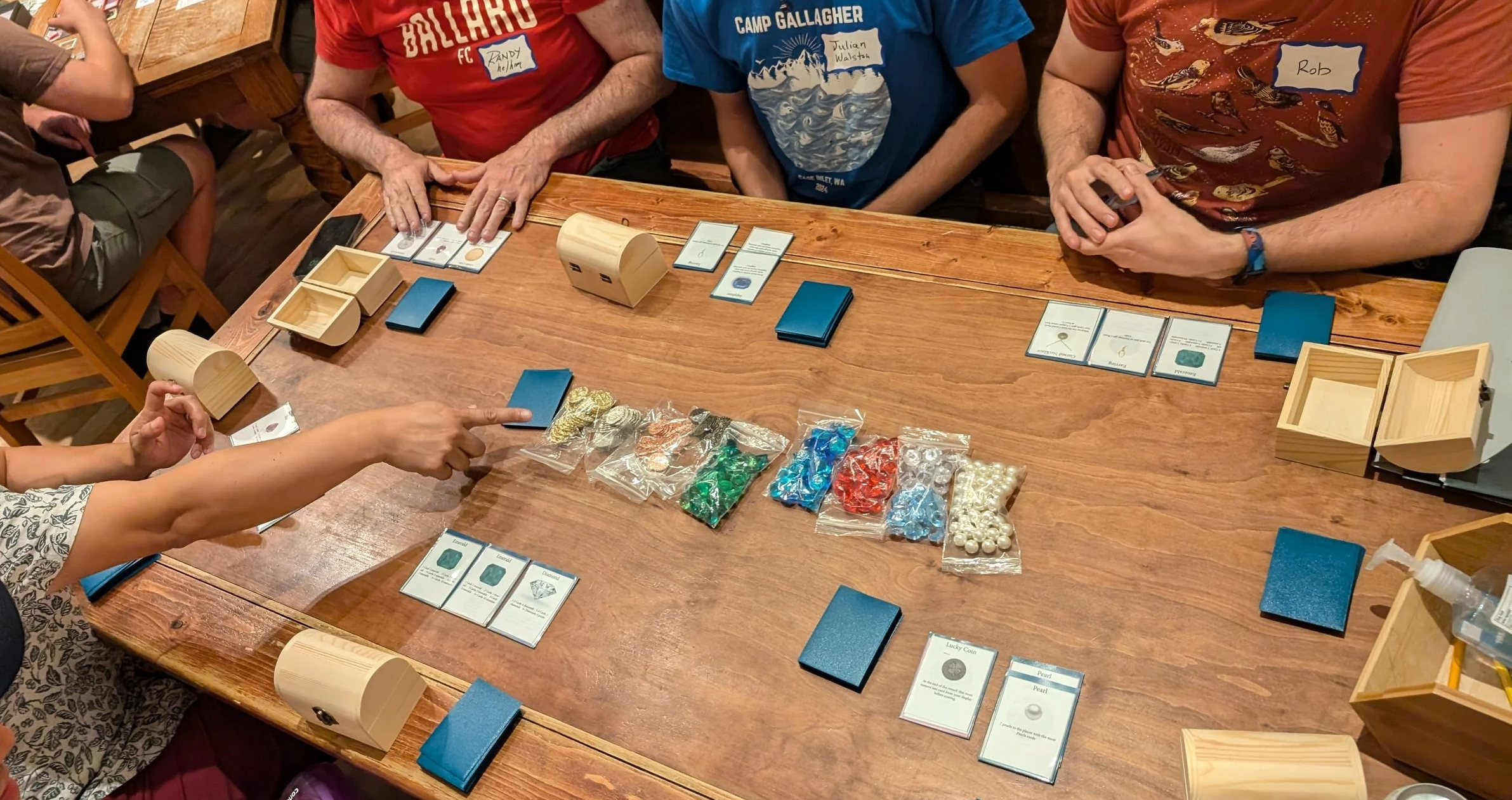 A pirate-themed, set collection drafting game in which players spend the first phase choosing cards to keep and give to their neighbors, then collect physical treasure pieces based on their tableaus. The player with the heaviest treasure wins!