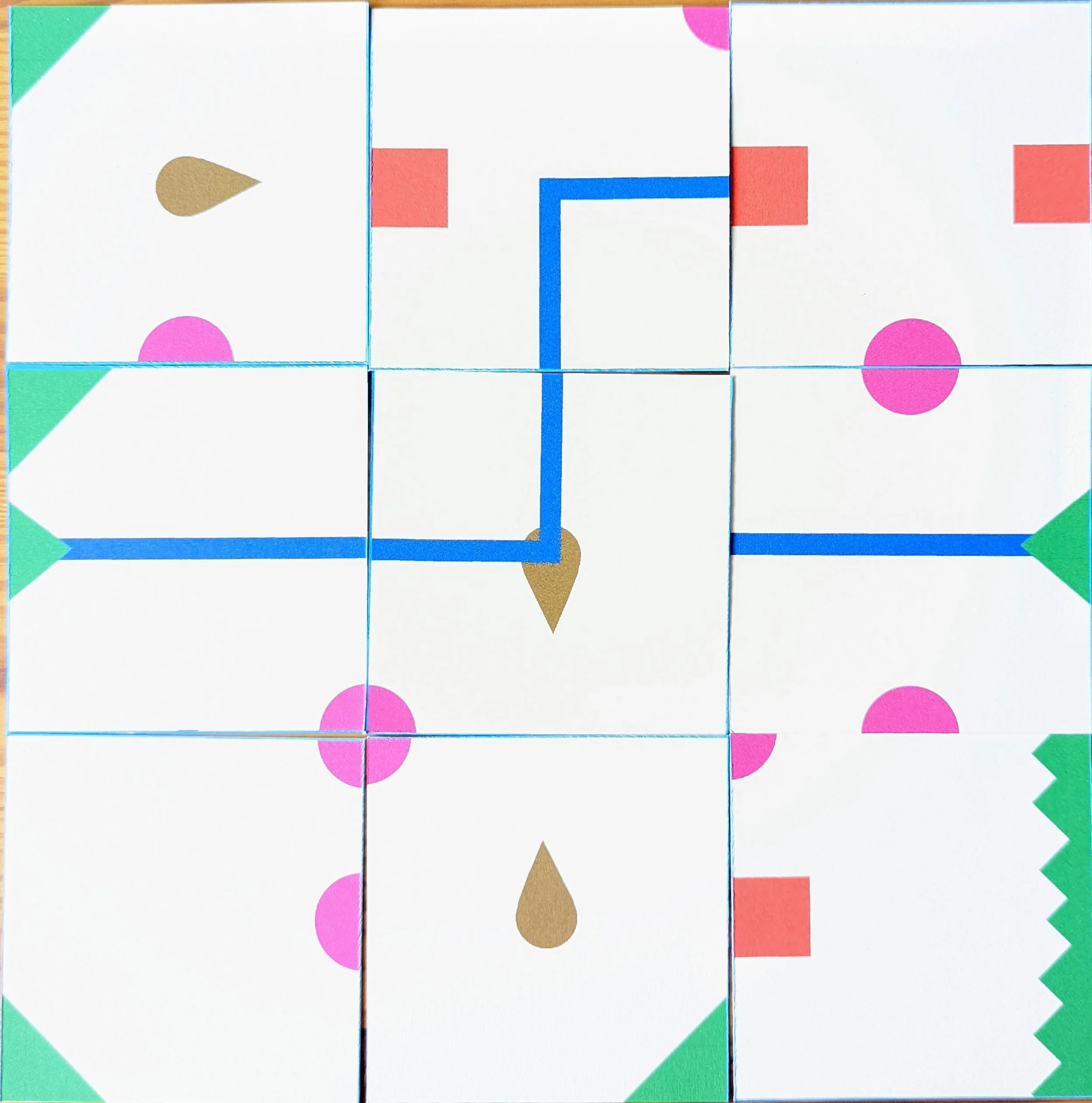 A puzzle-y logic game where players place nine square cards in individual 3x3 grids over nine turns, working to satisfy the conditions on the cards in the best way possible. The symbols graphically represent how they want to interact with other symbols, and with the bounds of the play space.